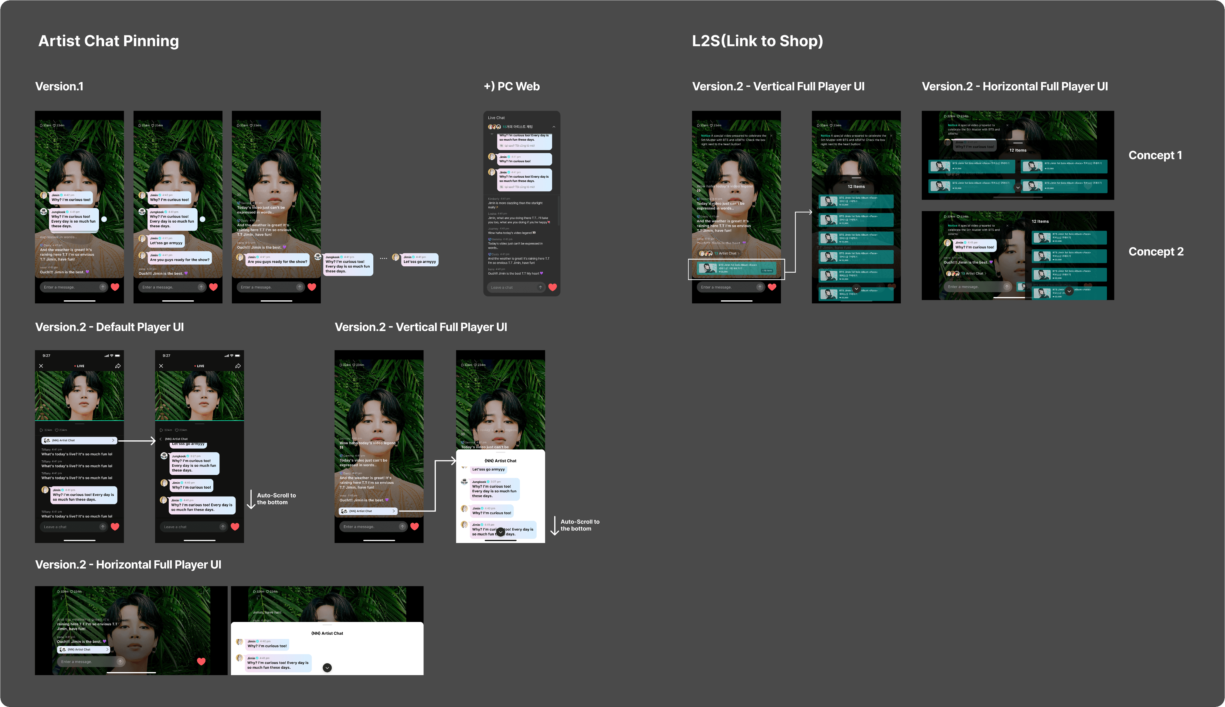 Since the basic design guidelines for the existing Weverse LIVE feature were already in place, I ideated various versions of UX structures to integrate new features into the existing design.