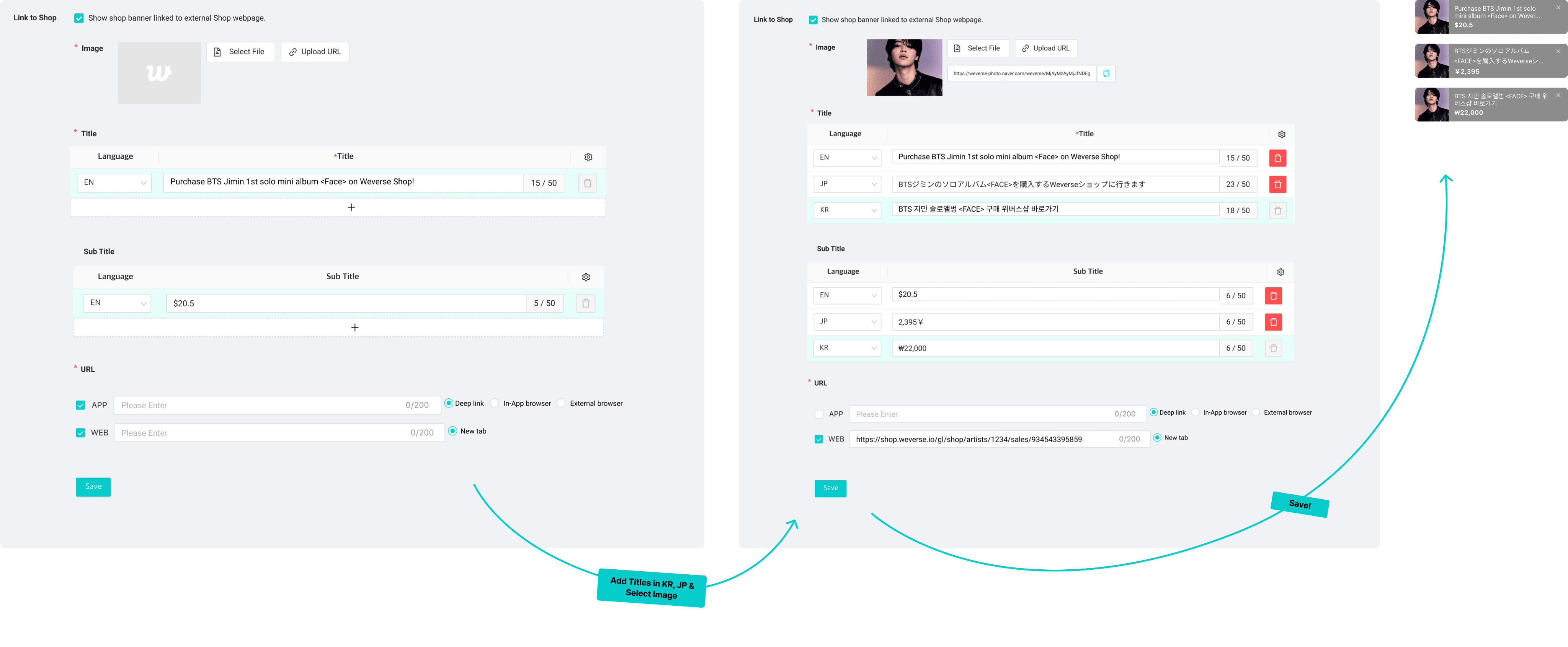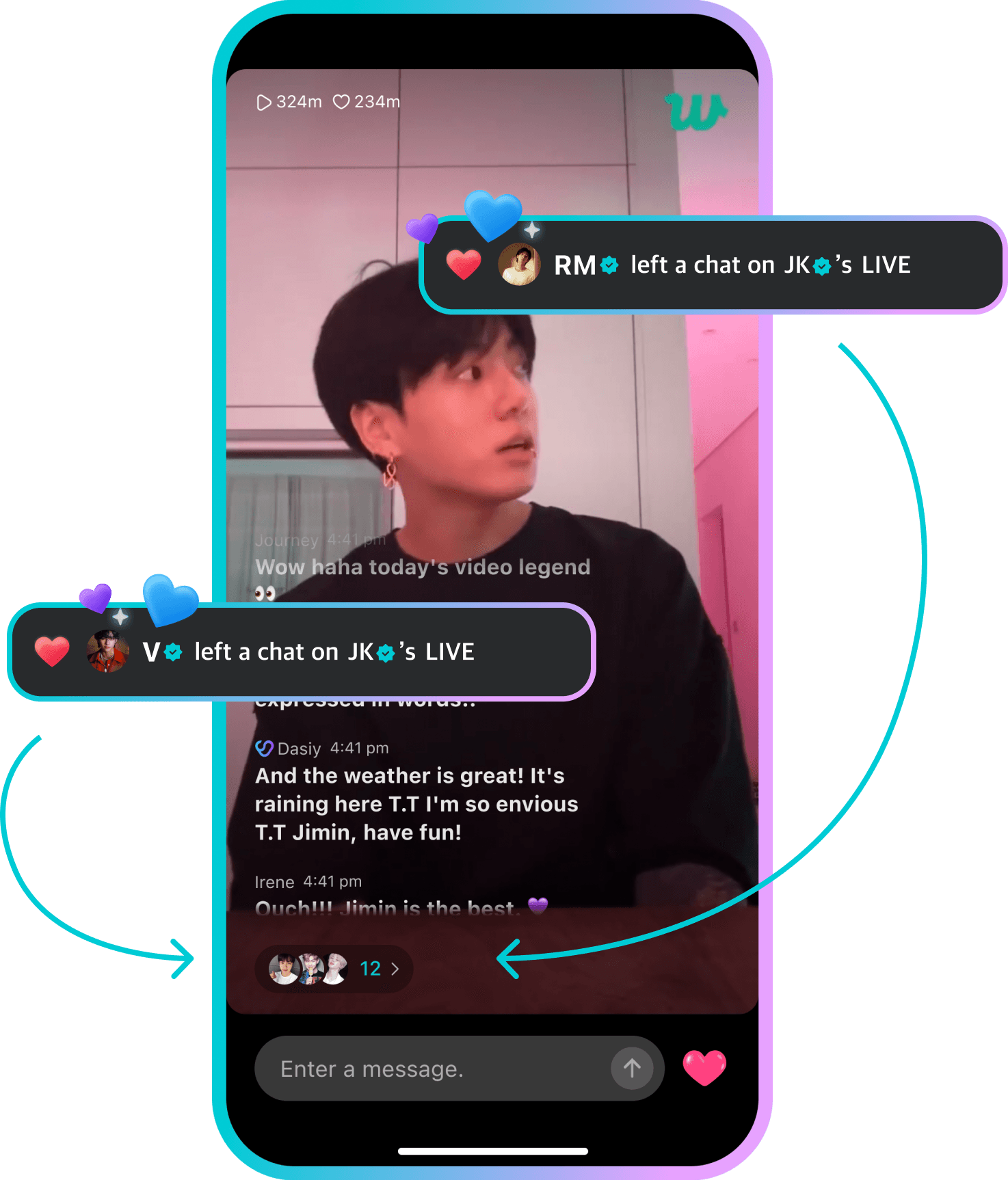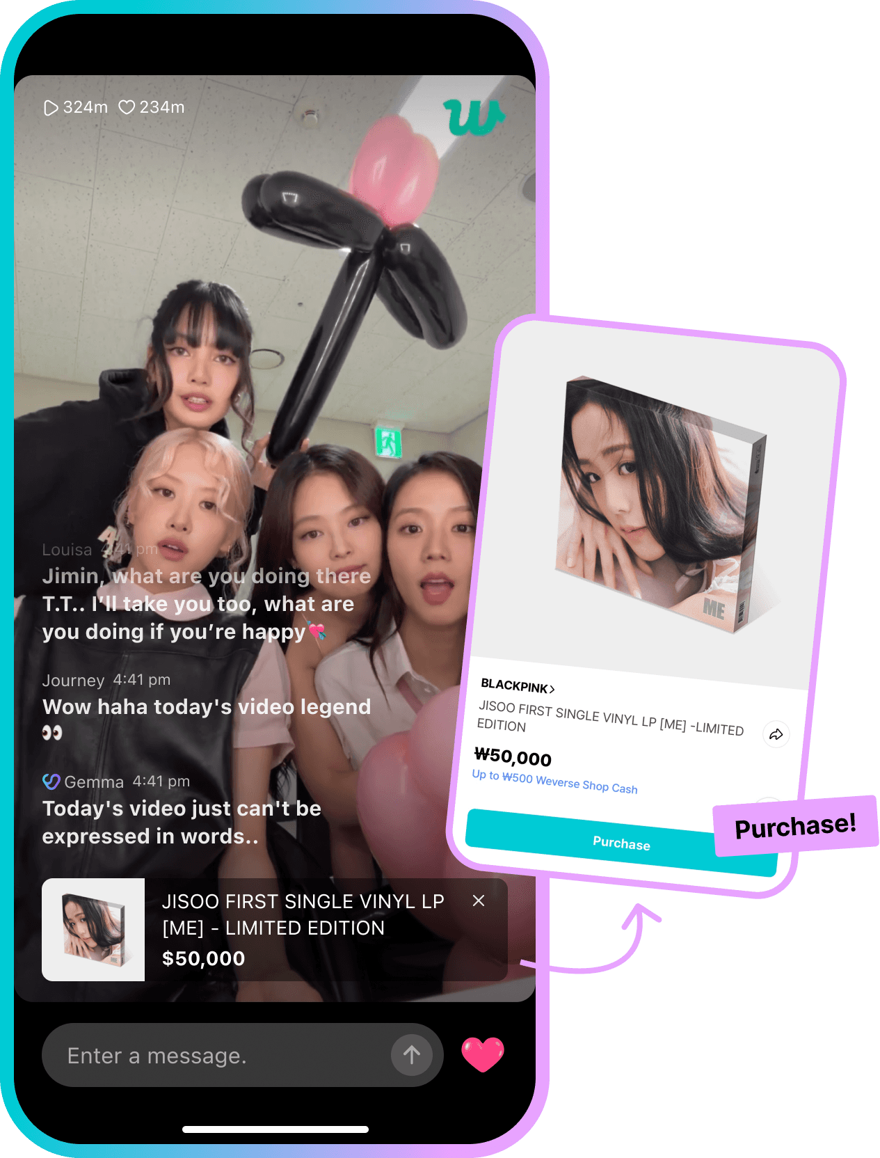 Weverse LIVE is designed to foster real-time interaction between fans and artists, enhancing engagement and active participation. In this project, we developed the Artist Chat Pinning and Real-time Commerce (L2S - Link to Shop) features to optimize fandom-centric UX and integrate seamless real-time commerce.